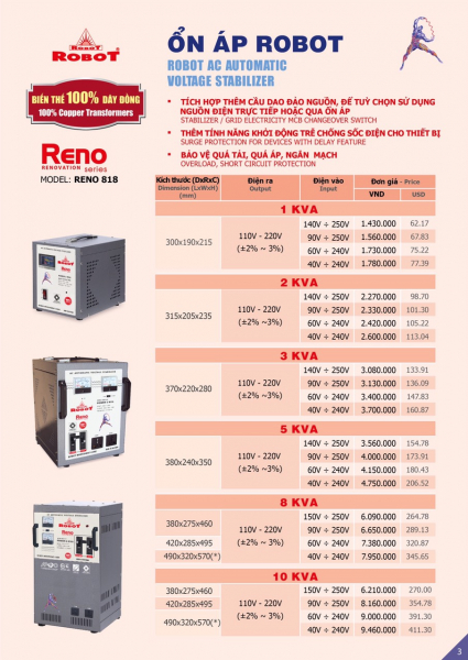 Giá Ổn Áp Robot phụ thuộc vào nhiều yếu tố: công suất, dải điện vào, lõi dây đồng hay nhôm, số pha...