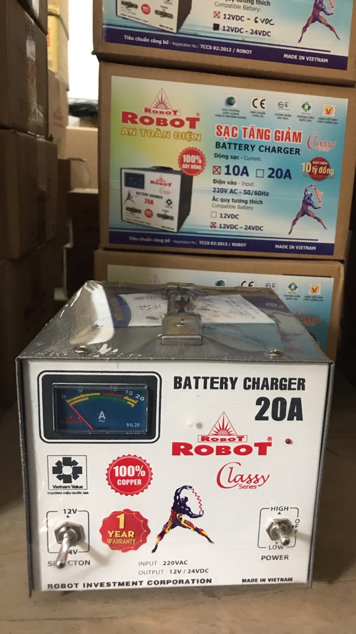 Sạc Tăng Giảm Robot có 2 loại chính: Sạc Tăng Giảm Robot dây nhôm ( AP15 dây nhôm) và Sạc Tăng Giảm Robot dây đồng ( Classy 100% dây đồng). Trong mỗi loại Sạc Tăng Giảm Robot lại có nhiều công suất cũng như dòng điện ắc quy khác nhau. Tùy vào mục đích sử dụng mà quý khách có thể chọn cho riêng mình một Sạc Tăng Giảm Robot nhất định. Nhìn chung thì Sạc Tăng Giảm Robot có một số công năng: